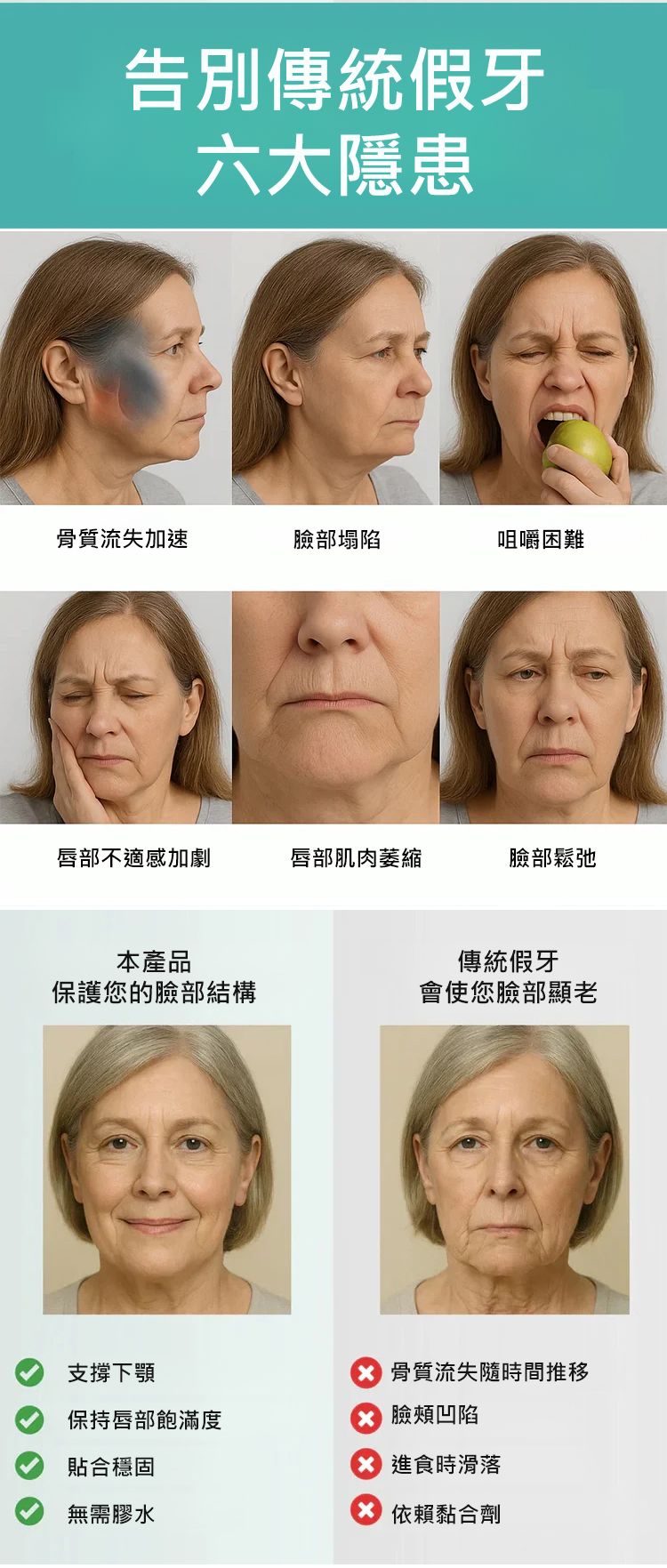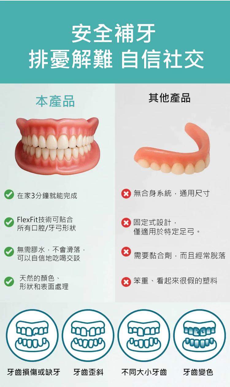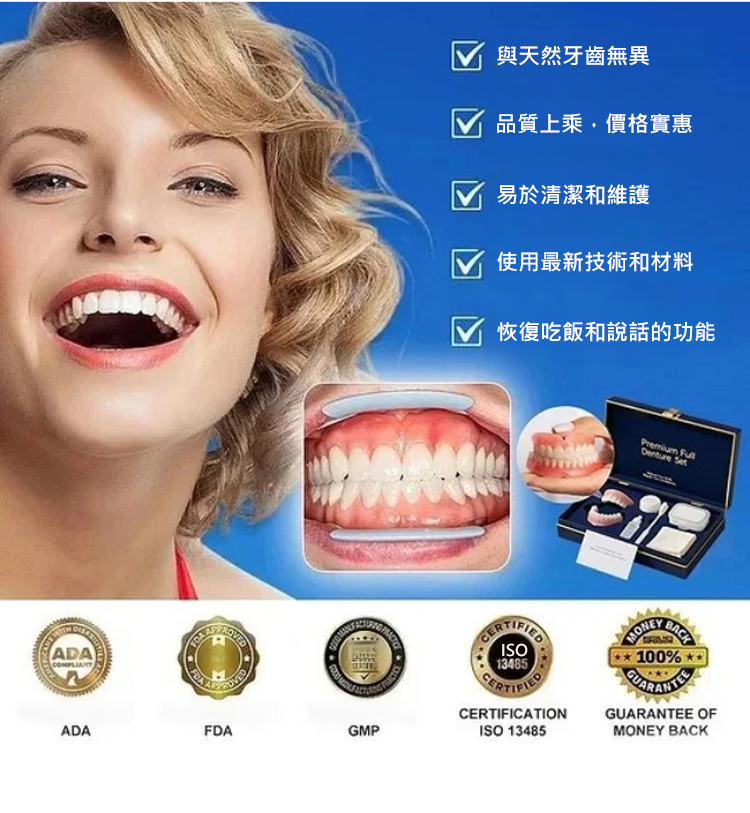 美國製造、FDA 認證嘅全口義齒套裝 以專業級標準為香港用家提供更穩定、更舒適嘅全口替代方案 義齒設計採用高穩定性複合物料 配合改良咬合曲線同貼合度 有效減低磨擦不適,提升日常佩戴穩定性 無論講話、進食定係長時間使用 都更接近自然口感 全套流程經過多項